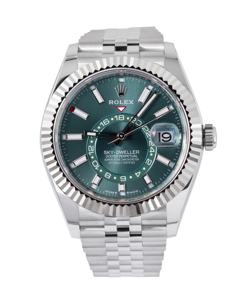 brand: Rolex Reference: 336934 Model: Sky-Dweller case MATERIAL: Steel strap: Bracelet case Size (MM): 42mm Dial colour: Green Bezel: White Gold Year: 10/2025 Condition: Unworn Box papers : Paperwork/box