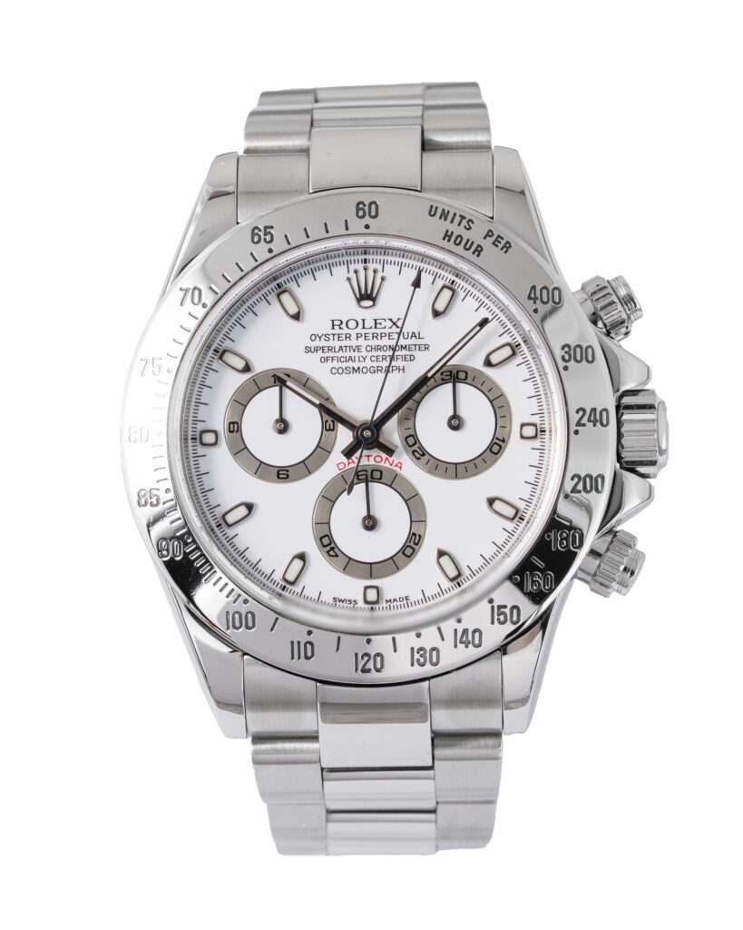 brand: Rolex Reference: 116520 Model: Daytona case MATERIAL: Steel strap: Bracelet case Size (MM): 40mm Dial colour: White Bezel: Steel Year: 06/2005 Condition: Excellent Box papers : Paperwork/box