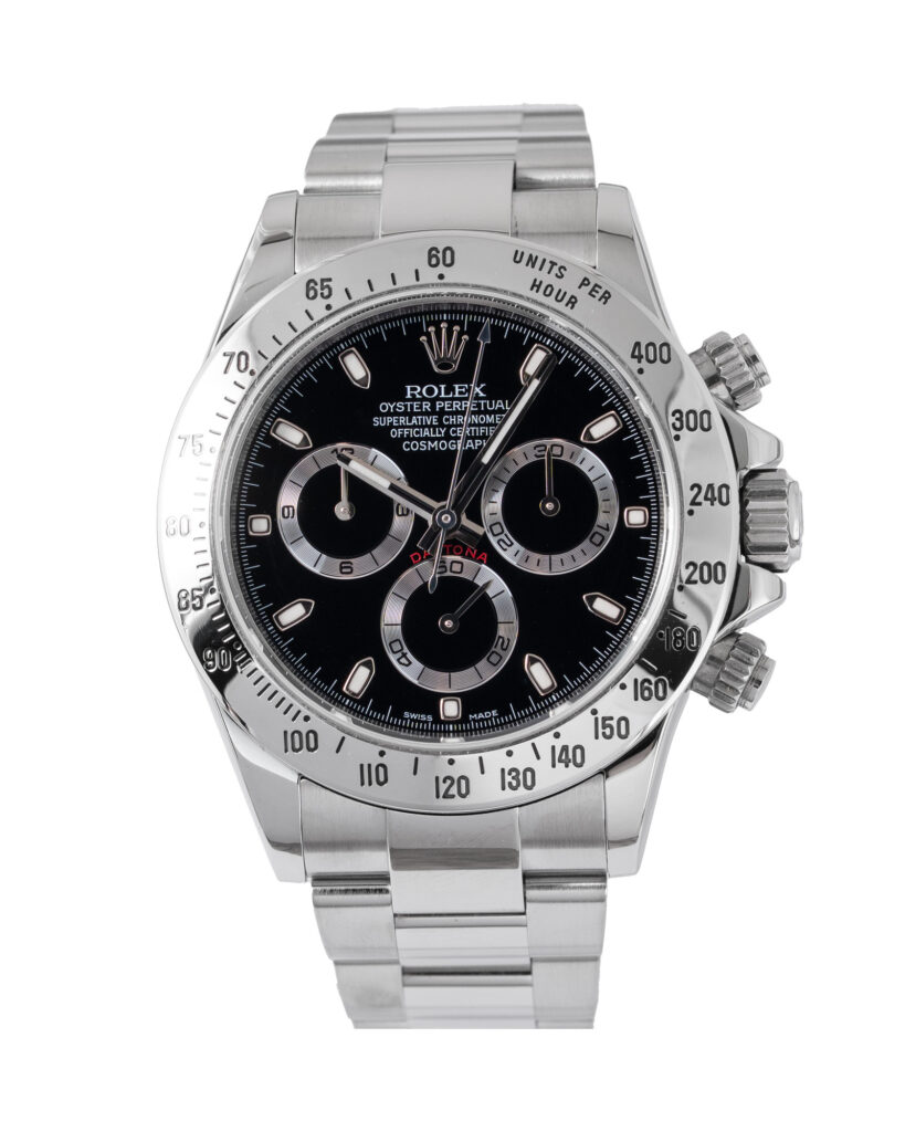brand: Rolex Reference: 116520 Model: Daytona case MATERIAL: Steel strap: Bracelet case Size (MM): 40mm Dial colour: Black Bezel: Steel Year: 11/2014 Condition: Excellent Box papers : Paperwork/box