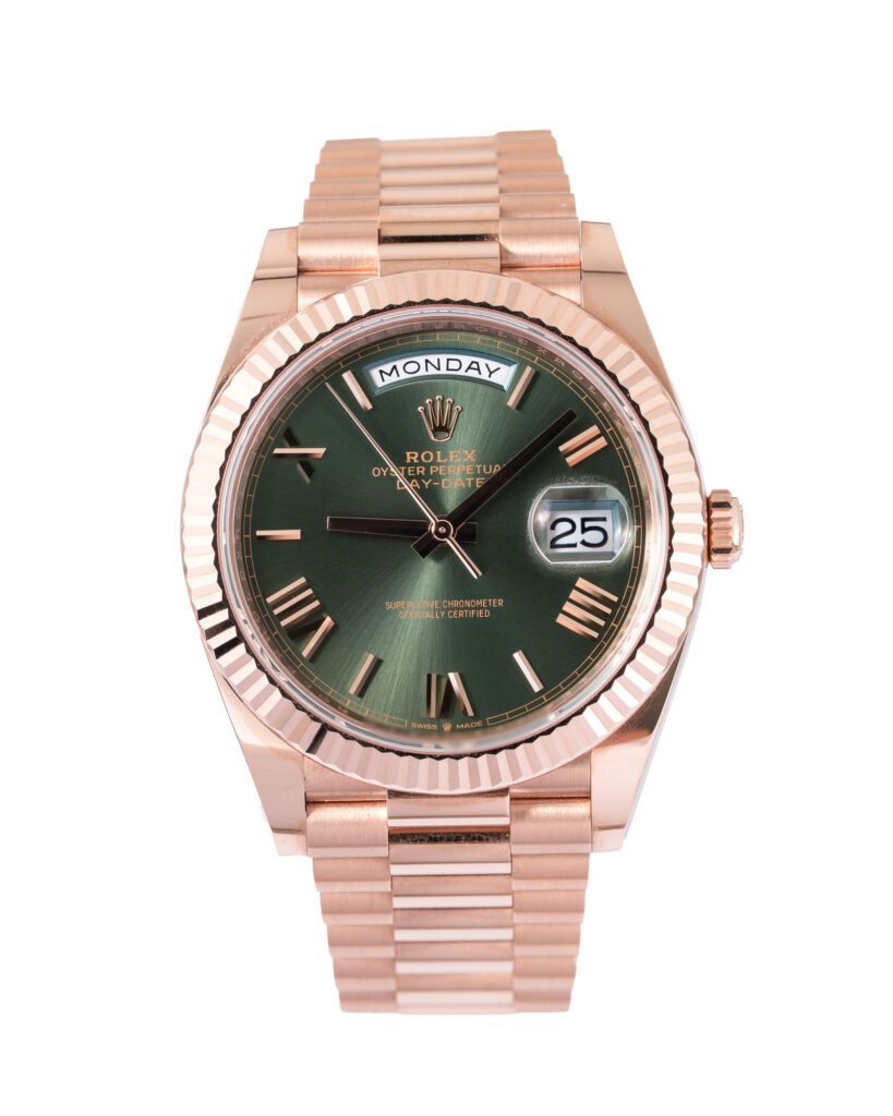 brand: Rolex Reference: 228235 Model: Day-Date case MATERIAL: Rose Gold strap: Bracelet case Size (MM): 40mm Dial colour: Green Bezel: Rose Gold Year: 04/2025 Condition: Unworn Box papers : Paperwork/box