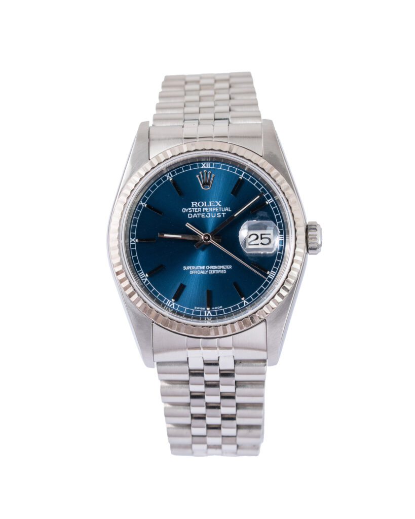 brand: Rolex Reference: 16234 Model: Datejust case MATERIAL: Steel strap: Bracelet case Size (MM): 36mm Dial colour: Blue Bezel: White Gold Year: 01/2005 Condition: Excellent Box papers : Paperwork/box