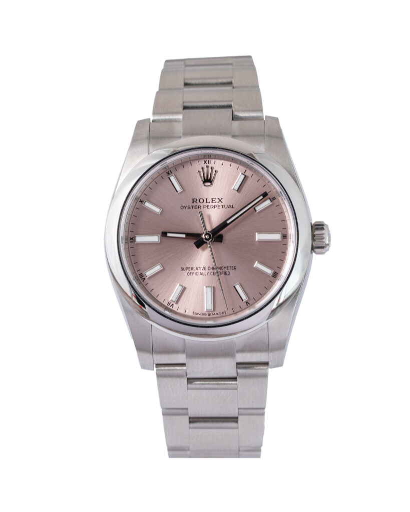 brand: Rolex Reference: 124200 Model: Oyster Perpetual case MATERIAL: Steel strap: Bracelet case Size (MM): 34mm Dial colour: Pink Bezel: Steel Year: 04/2025 Condition: Unworn Box papers : Paperwork/box