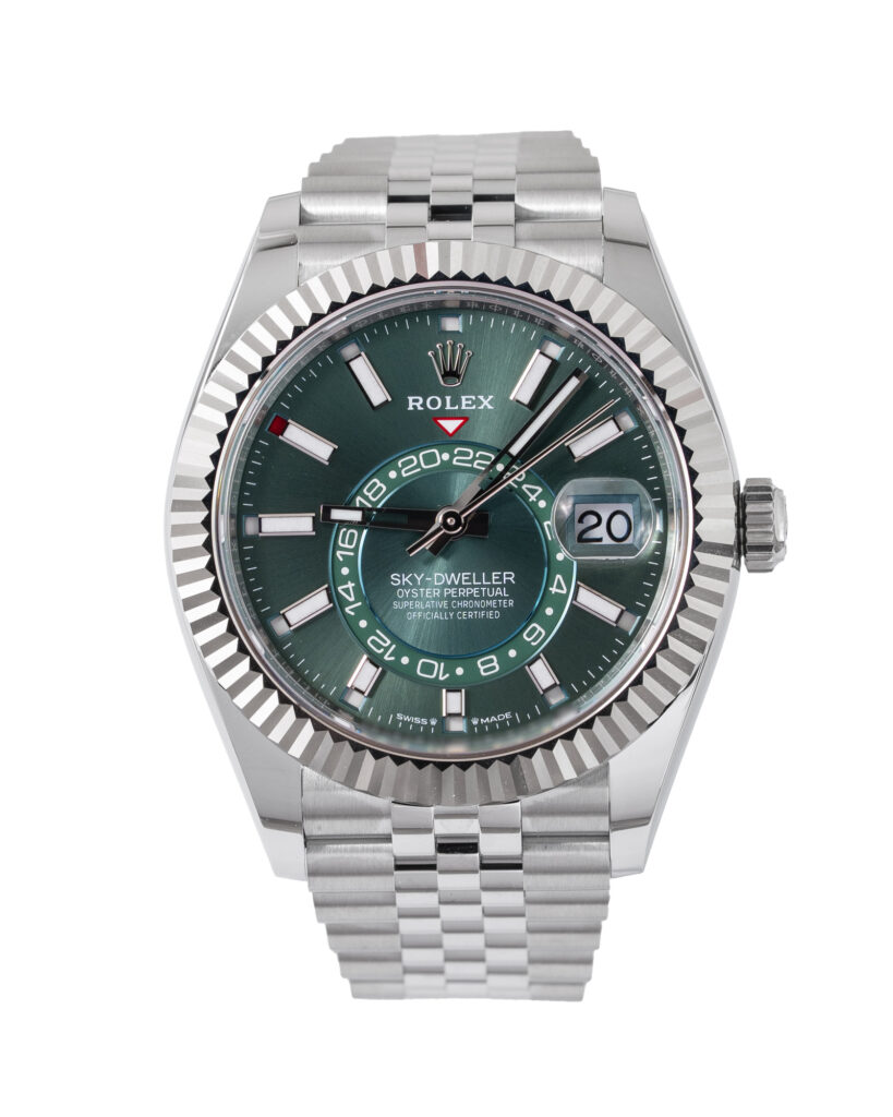 brand: Rolex Reference: 336934 Model: Sky-Dweller case MATERIAL: Steel strap: Bracelet case Size (MM): 42mm Dial colour: Green Bezel: White Gold Year: 10/2025 Condition: Unworn Box papers : Paperwork/box