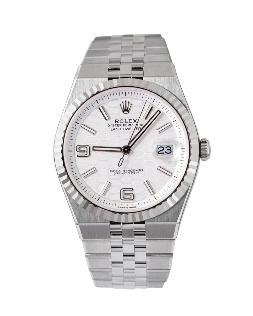 brand: Rolex Reference: 127334 Model: Land-Dweller case MATERIAL: Steel strap: Bracelet case Size (MM): 40mm Dial colour: White Bezel: White Gold Year: 10/2025 Condition: Unworn Box papers : Paperwork/box
