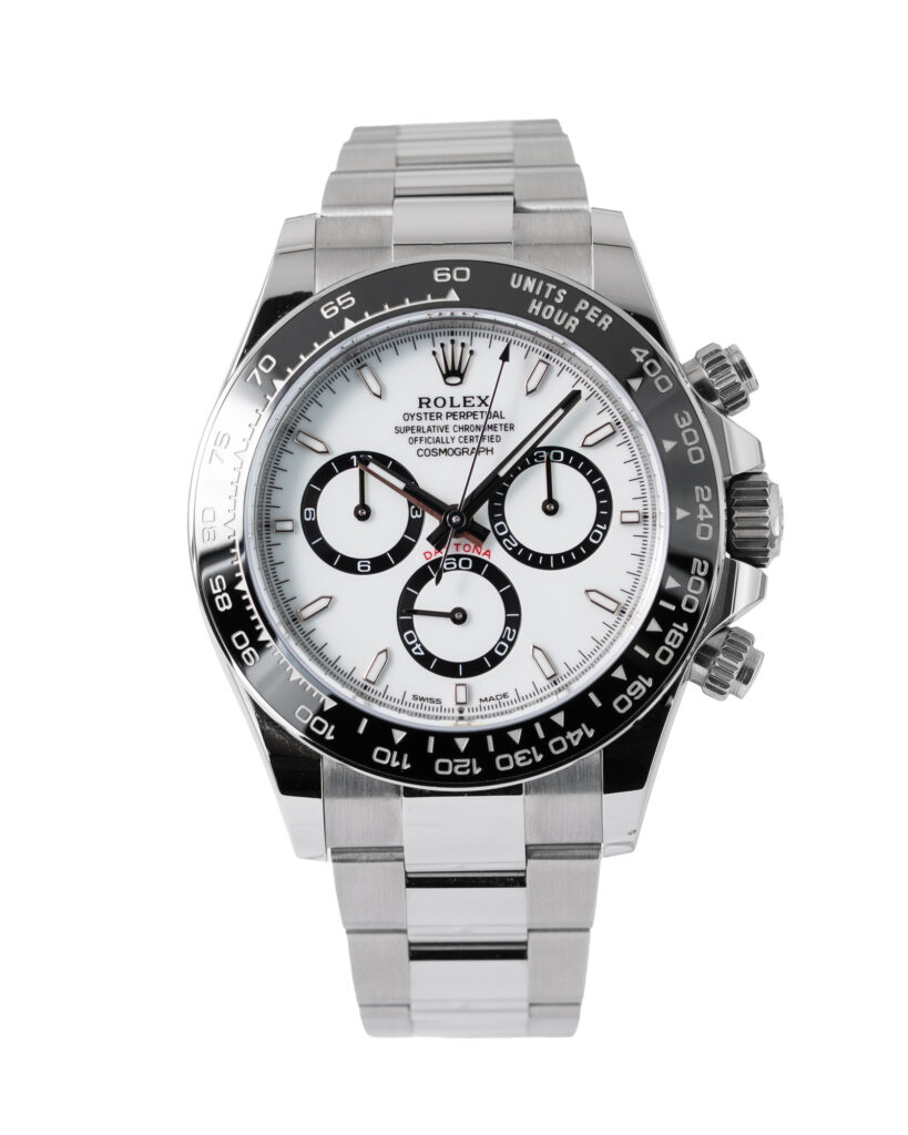 brand: Rolex Reference: 126500LN Model: Daytona case MATERIAL: Steel strap: Bracelet case Size (MM): 40mm Dial colour: White Bezel: Ceramic Year: 11/2024 Condition: Excellent Box papers : Paperwork/box