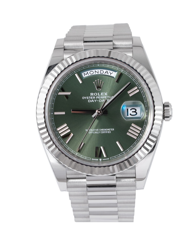 brand: Rolex Reference: 228239 Model: Day-Date case MATERIAL: White Gold strap: Bracelet case Size (MM): 40mm Dial colour: Green Bezel: White Gold Year: 09/2022 Condition: Unworn Box papers : Paperwork/box