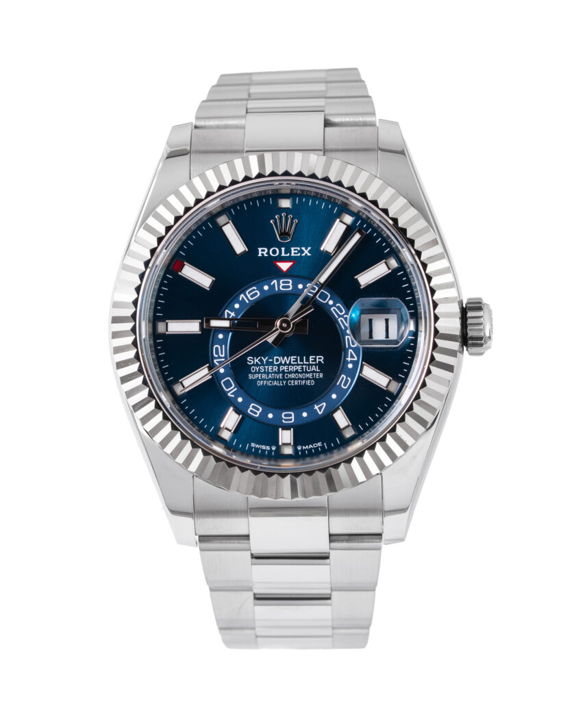 brand: Rolex Reference: 336934 Model: Sky-Dweller case MATERIAL: Steel strap: Bracelet case Size (MM): 42mm Dial colour: Blue Bezel: White Gold Year: 02/2024 Condition: Excellent Box papers : Paperwork/box