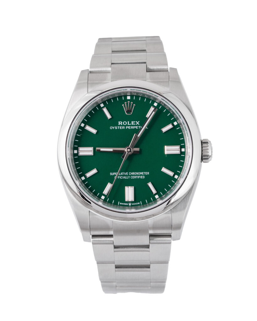 brand: Rolex Reference: 126000 Model: Oyster Perpetual case MATERIAL: Steel strap: Bracelet case Size (MM): 36mm Dial colour: Green Bezel: Steel Condition: Unworn Box papers : Paperwork/box