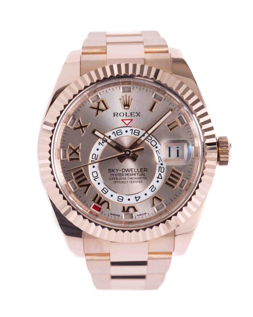 brand: Rolex Reference: 326935 Model: Sky-Dweller case MATERIAL: Rose Gold strap: Bracelet case Size (MM): 42mm Dial colour: Silver Bezel: Rose Gold Year: 03/2018 Condition: Excellent Box papers : Paperwork/box
