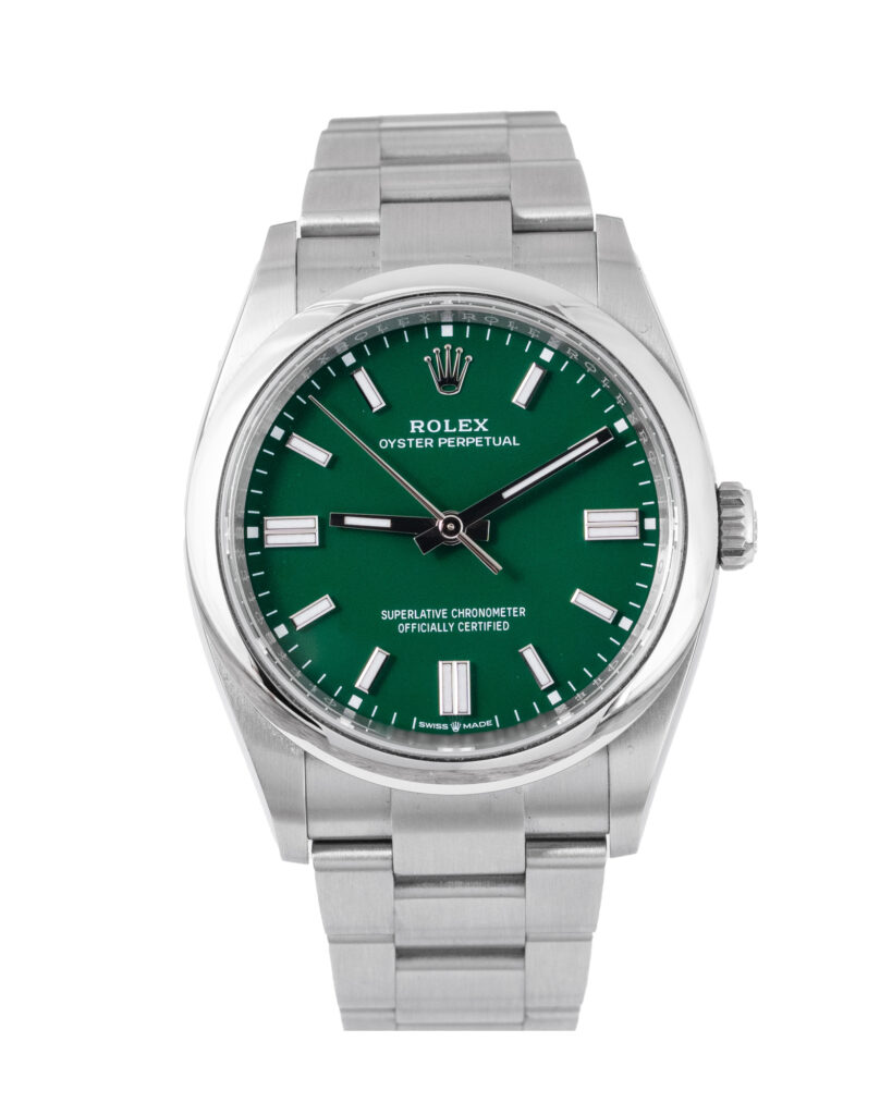 brand: Rolex Reference: 126000 Model: Oyster Perpetual case MATERIAL: Steel strap: Bracelet case Size (MM): 36mm Dial colour: Green Bezel: Steel Year: 09/2025 Condition: Unworn Box papers : Paperwork/box