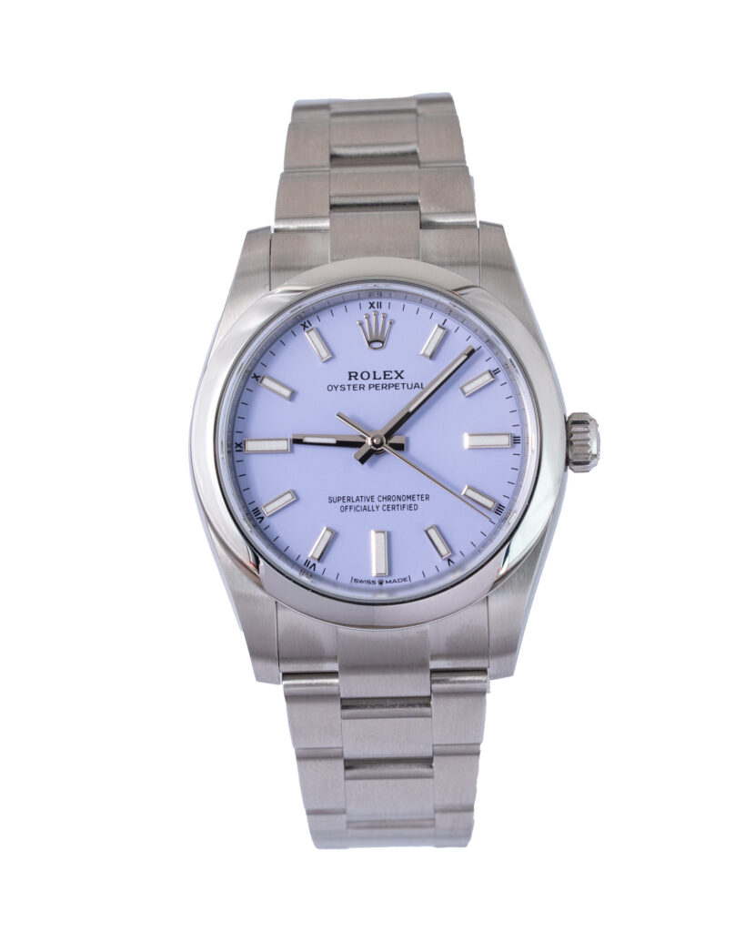 brand: Rolex Reference: 124200 Model: Oyster Perpetual case MATERIAL: Steel strap: Bracelet case Size (MM): 34mm Dial colour: Purple Bezel: Steel Year: 09/2025 Condition: Unworn Box papers : Paperwork/box