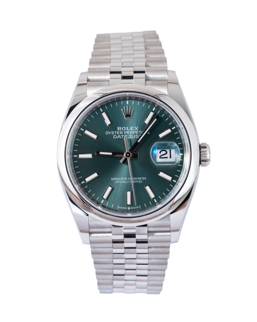 brand: Rolex Reference: 126200 Model: Datejust case MATERIAL: Steel strap: Bracelet case Size (MM): 36mm Dial colour: Green Bezel: Steel Year: 09/2025 Condition: Unworn Box papers : Paperwork/box