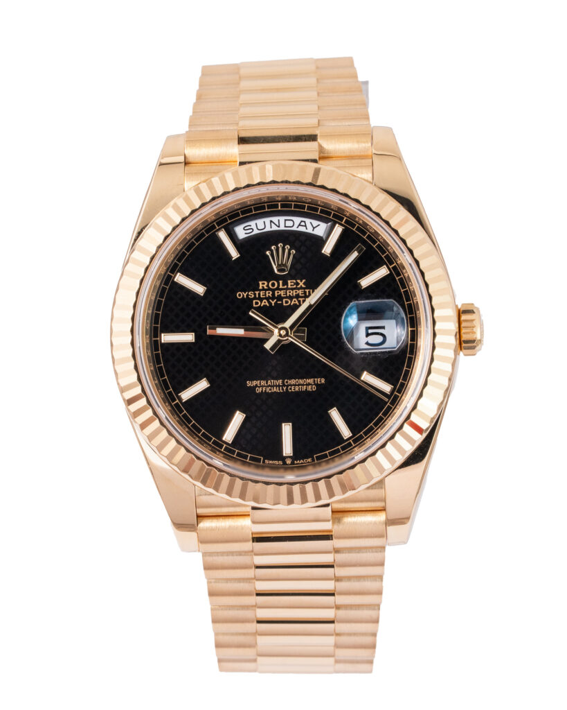 brand: Rolex Reference: 228238 Model: Day-Date case MATERIAL: Yellow Gold strap: Bracelet case Size (MM): 40mm Dial colour: Black Bezel: Yellow Gold Year: 03/2022 Condition: Excellent Box papers : Paperwork/box