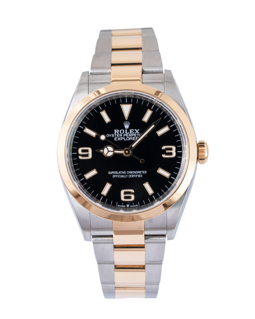 brand: Rolex Reference: 124273 Model: Explorer case MATERIAL: Steel & Yellow Gold strap: Bracelet case Size (MM): 36mm Dial colour: Black Bezel: Yellow Gold Year: 03/2023 Condition: Excellent Box papers : Paperwork/box
