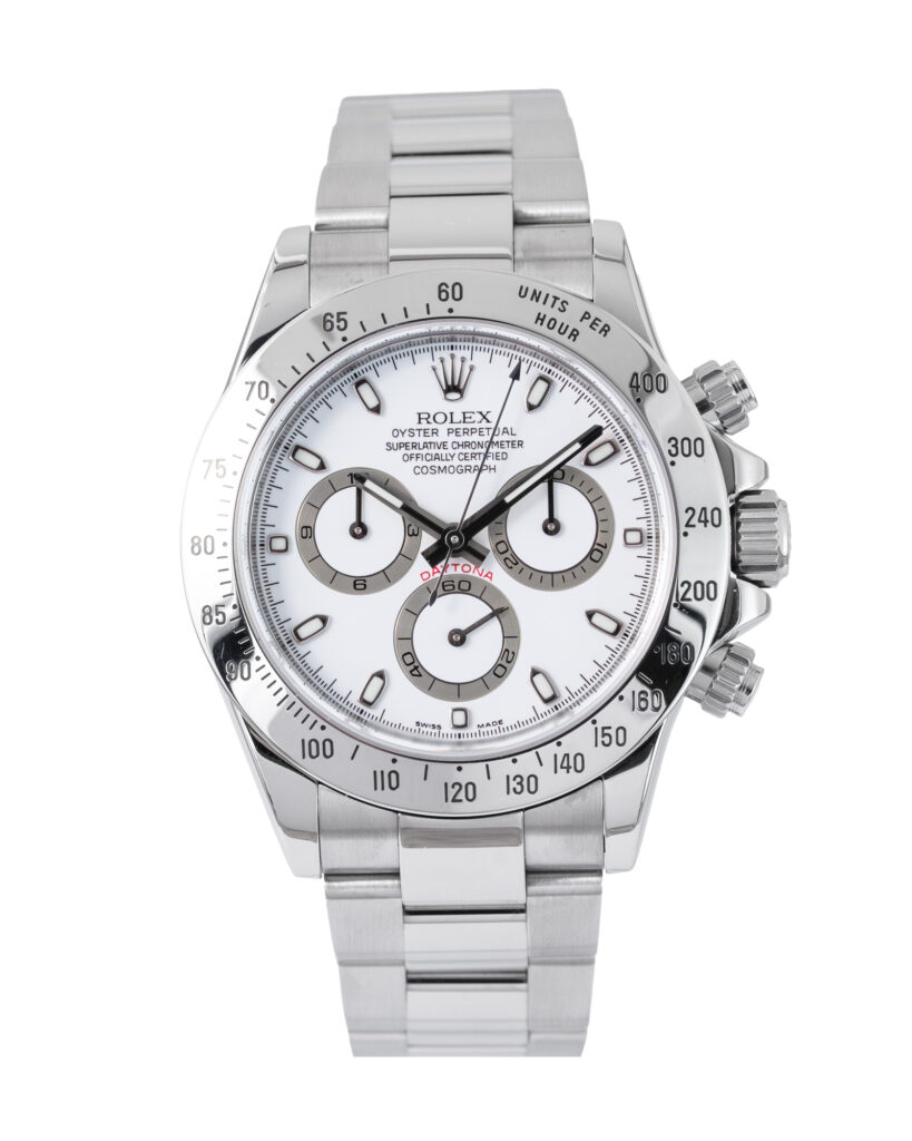 brand: Rolex Reference: 116520 Model: Daytona case MATERIAL: Steel strap: Bracelet case Size (MM): 40mm Dial colour: White Bezel: Steel Year: 10/2008 Condition: Excellent Box papers : Paperwork/box