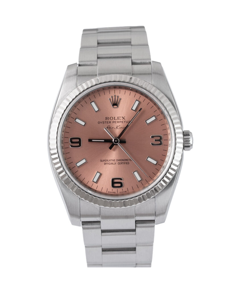 brand: Rolex Reference: 114234 Model: Air-King case MATERIAL: Steel strap: Bracelet case Size (MM): 34mm Dial colour: Pink Bezel: White Gold Year: 01/2011 Condition: Excellent Box papers : Paperwork/box