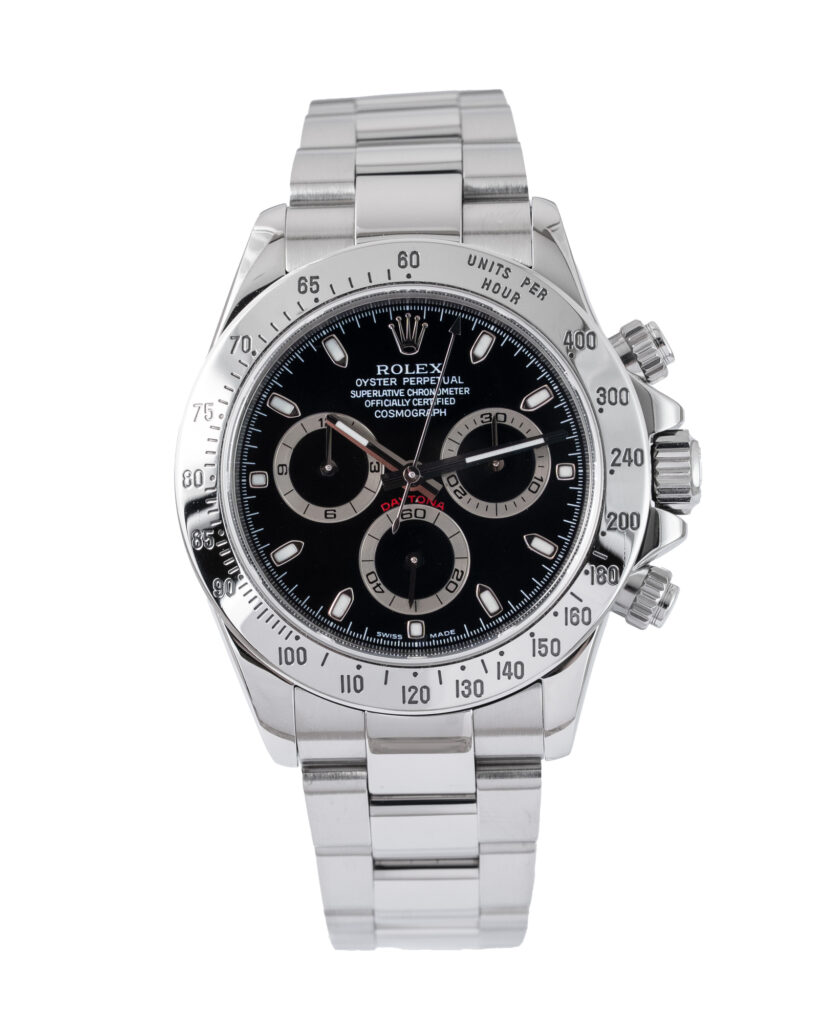 brand: Rolex Reference: 116520 Model: Daytona case MATERIAL: Steel strap: Bracelet case Size (MM): 40mm Dial colour: Black Bezel: Steel Year: 09/2005 Condition: Excellent Box papers : Paperwork/box
