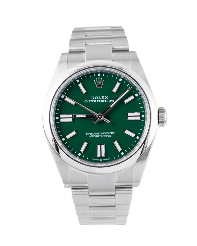 brand: Rolex Reference: 134300 Model: Oyster Perpetual case MATERIAL: Steel strap: Bracelet case Size (MM): 41mm Dial colour: Green Bezel: Steel Year: 08/2025 Condition: Unworn Box papers : Paperwork/box