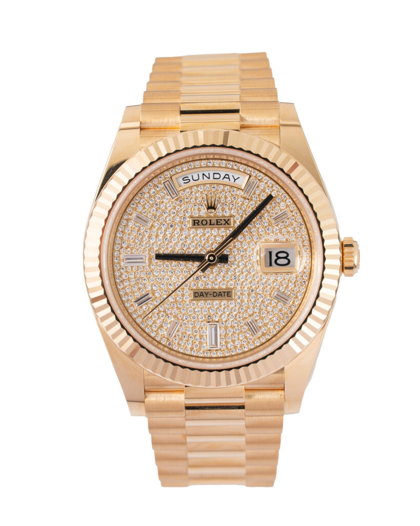 brand: Rolex Reference: 228238 Model: Day-Date case MATERIAL: Yellow Gold strap: Bracelet case Size (MM): 40mm Dial colour: Diamond Bezel: Yellow Gold Year: 03/2023 Condition: Unworn Box papers : Paperwork/box