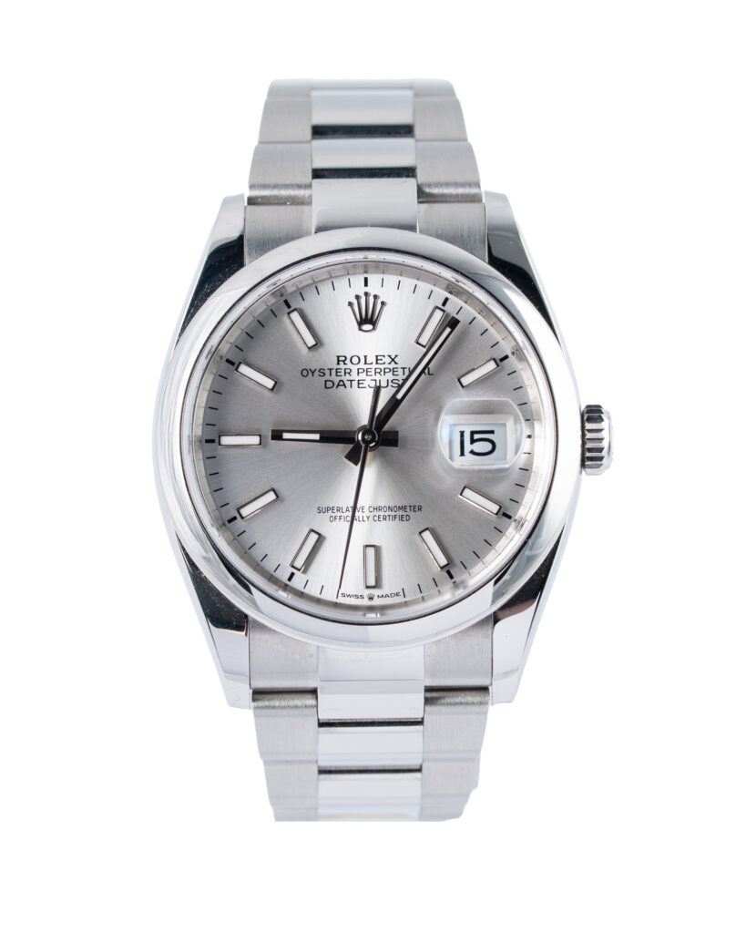 Make: Rolex Reference: 126200 Model: Datejust Case: Steel Bracelet: Bracelet Size: 36mm Dial colour: Silver Bezel: Smooth Year: 03/2022 Condition: Excellent Box papers : Paperwork/box