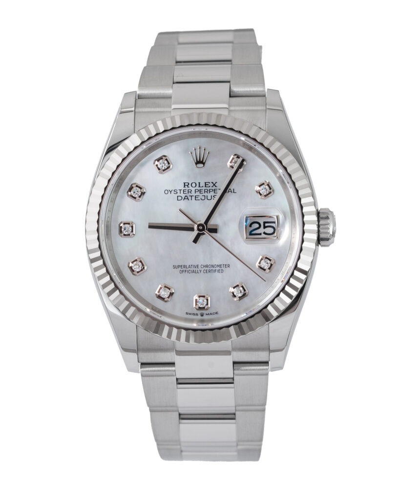 brand: Rolex Reference: 126234 Model: Datejust case MATERIAL: Steel strap: Bracelet case Size (MM): 36mm Dial colour: Mother Of Pearl Bezel: White Gold Year: 06/2024 Condition: Excellent Box papers : Paperwork/box