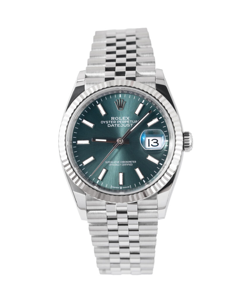 brand: Rolex Reference: 126234 Model: Datejust case MATERIAL: Steel strap: Bracelet case Size (MM): 36mm Dial colour: Green Bezel: White Gold Year: 05/2024 Condition: Excellent Box papers : Paperwork/box