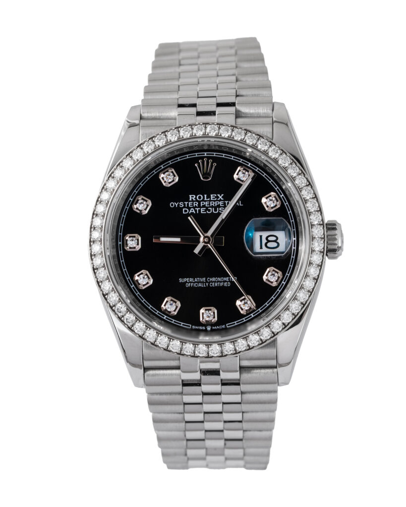 brand: Rolex Reference: 126284RBR Model: Datejust case MATERIAL: Steel strap: Bracelet case Size (MM): 36mm Dial colour: Black Bezel: Custom Diamond Year: 08/2021 Condition: Excellent Box papers : Paperwork/box