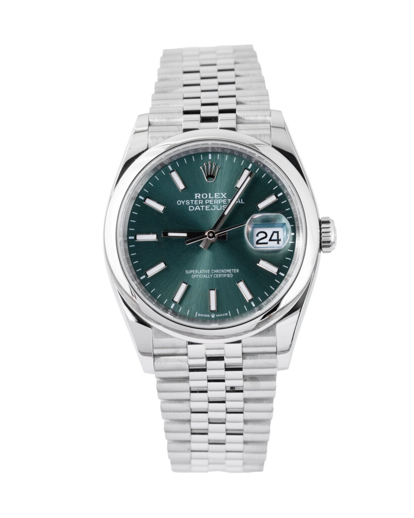 brand: Rolex Reference: 126200 Model: Datejust case MATERIAL: Steel strap: Bracelet case Size (MM): 36mm Dial colour: Green Bezel: Steel Year: 04/2024 Condition: Excellent Box papers : Paperwork/box
