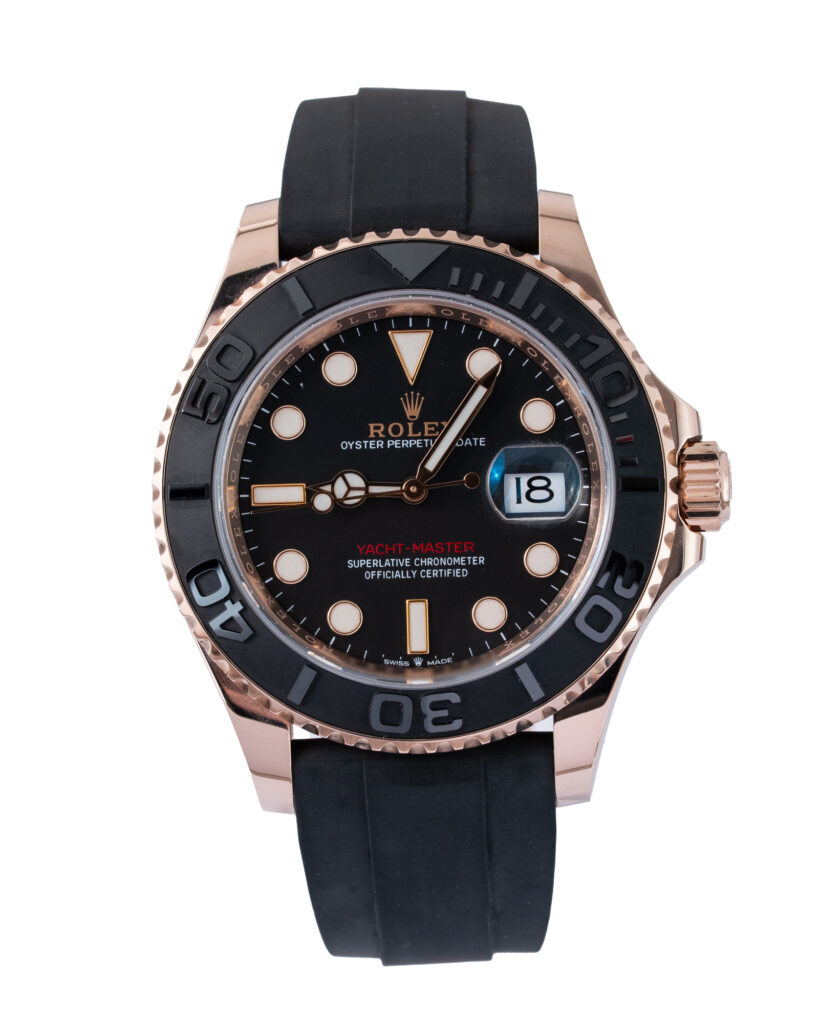 brand: Rolex Reference: 126655 Model: Yacht-Master case MATERIAL: Rose Gold strap: Rubber case Size (MM): 40mm Dial colour: Black Bezel: Steel Condition: Excellent Box papers : Paperwork/box