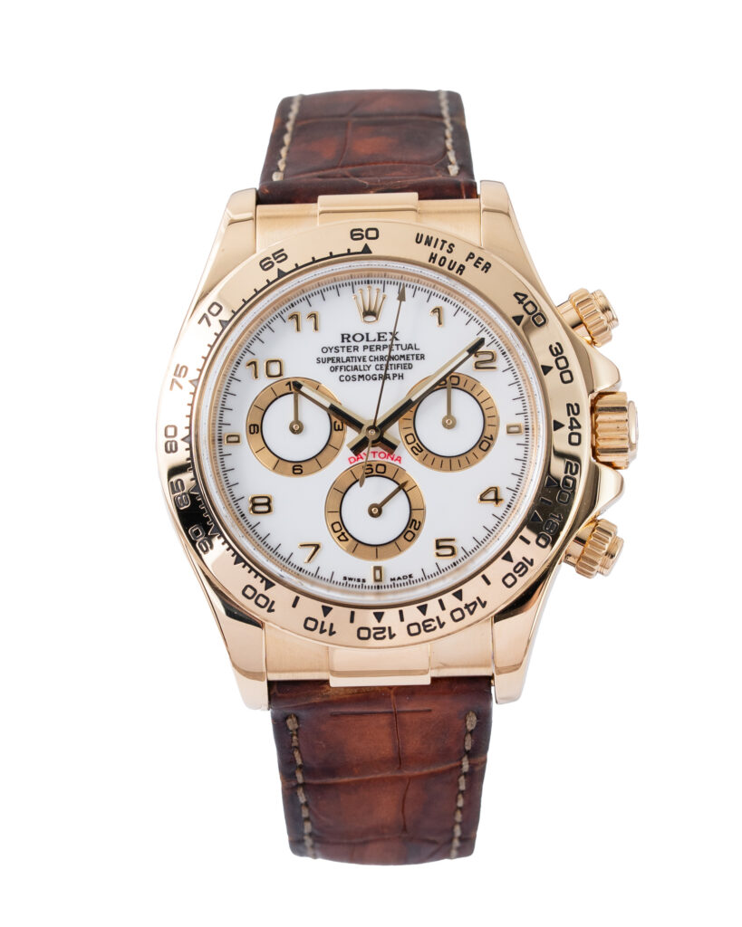 brand: Rolex Reference: 116518 Model: Daytona case MATERIAL: Yellow Gold strap: Leather case Size (MM): 40mm Dial colour: White Bezel: Yellow Gold Year: 08/2005 Condition: Excellent Box papers : Paperwork/box