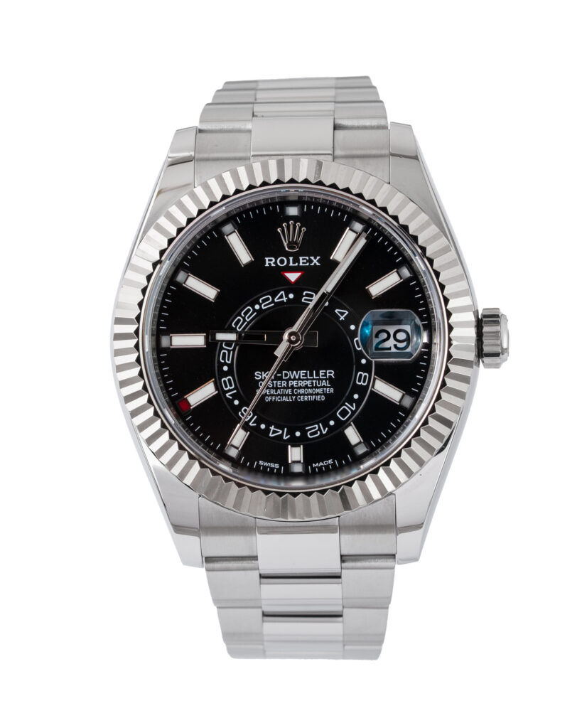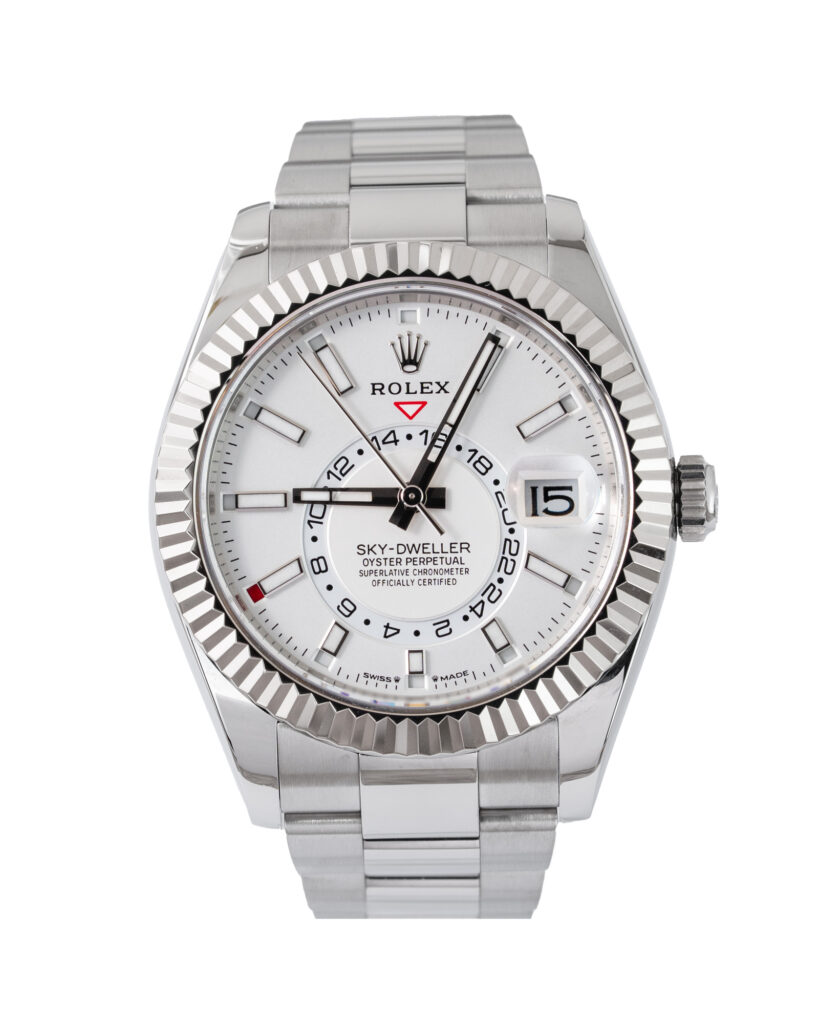 brand: Rolex Reference: 336934 Model: Sky-Dweller case MATERIAL: Steel strap: Bracelet case Size (MM): 42mm Dial colour: White Bezel: White Gold Year: 09/2023 Condition: Excellent Box papers : Paperwork/box