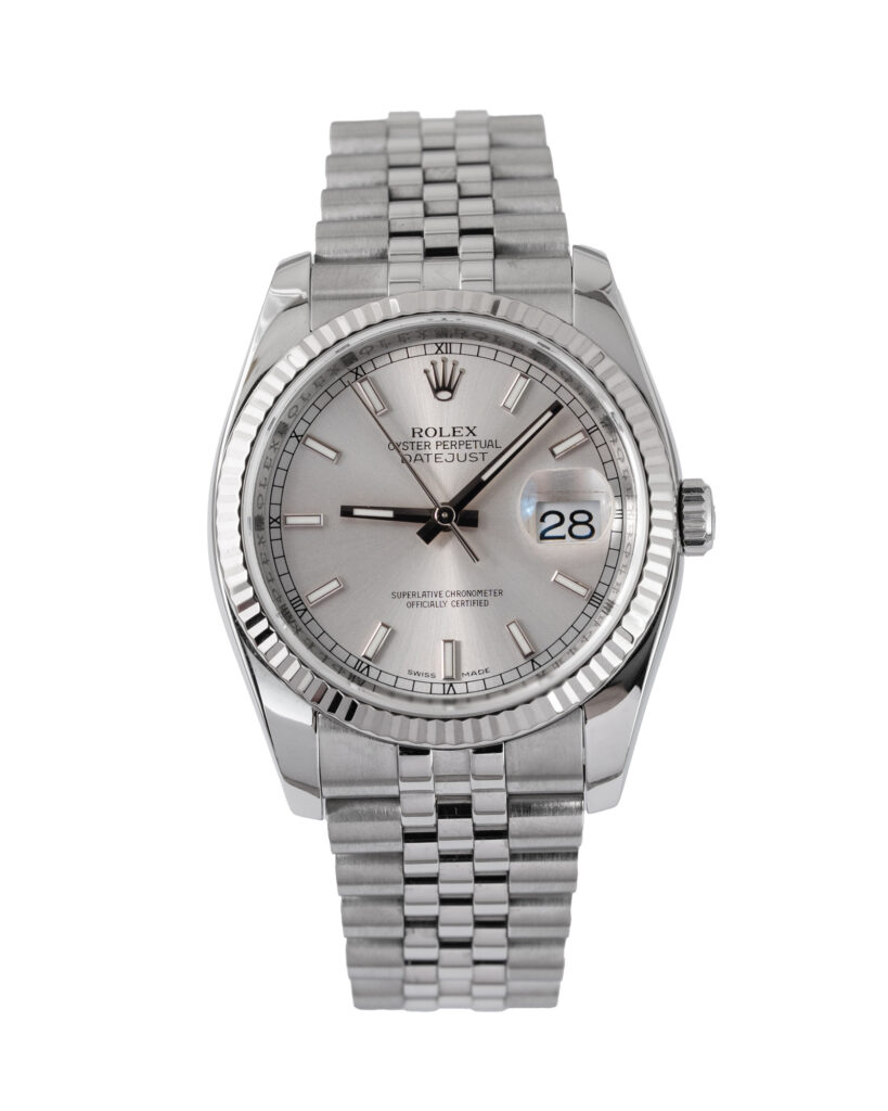 brand: Rolex Reference: 116234 Model: Datejust case MATERIAL: Steel strap: Bracelet case Size (MM): 36mm Dial colour: Silver Bezel: White Gold Year: 08/2012 Condition: Excellent Box papers : Complete