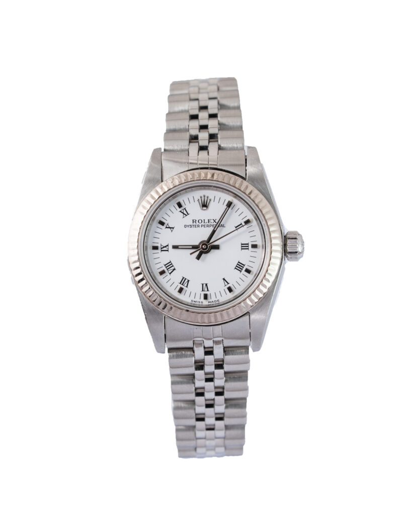 brand: Rolex Reference: 76094 Model: Oyster Perpetual case MATERIAL: Steel strap: Bracelet case Size (MM): 26mm Dial colour: White Bezel: White Gold Year: 07/2006 Condition: Excellent Box papers : Paperwork/box