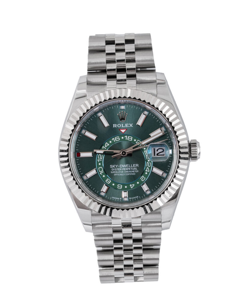 brand: Rolex Reference: 336934 Model: Sky-Dweller case MATERIAL: Steel strap: Bracelet case Size (MM): 42mm Dial colour: Green Bezel: White Gold Year: 10/2024 Condition: Excellent Box papers : Paperwork/box