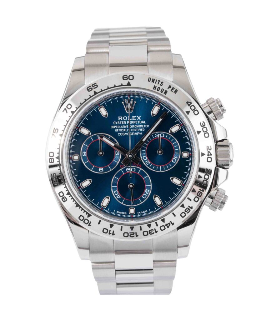 brand: Rolex Reference: 116509 Model: Daytona case MATERIAL: White Gold strap: Bracelet case Size (MM): 40mm Dial colour: Blue Bezel: White Gold Year: 12/2016 Condition: Excellent Box papers : Paperwork/box