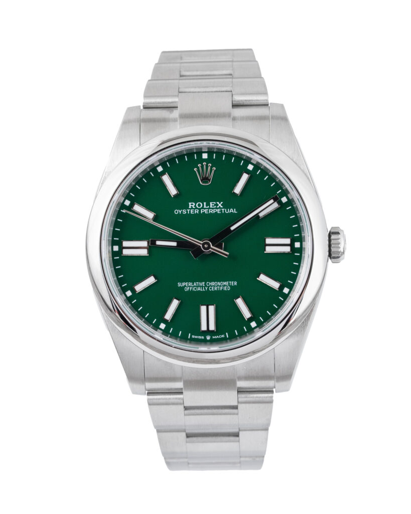 brand: Rolex Reference: 124300 Model: Oyster Perpetual case MATERIAL: Steel strap: Bracelet case Size (MM): 41mm Dial colour: Green Bezel: Steel Year: 09/2024 Condition: Excellent Box papers : Paperwork/box