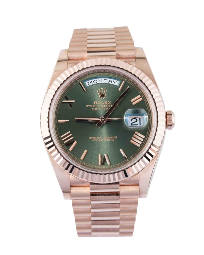 brand: Rolex Reference: 228235 Model: Day-Date case MATERIAL: Rose Gold strap: Bracelet case Size (MM): 40mm Dial colour: Green Bezel: Rose Gold Year: 12/2022 Condition: Excellent Box papers : Paperwork/box