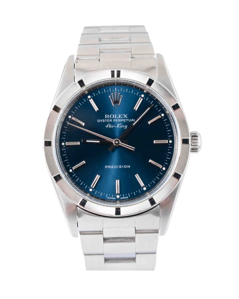 brand: Rolex Reference: 14010M Model: Air-King case MATERIAL: Steel strap: Bracelet case Size (MM): 34mm Dial colour: Blue Bezel: Steel Condition: Excellent Box papers : Box