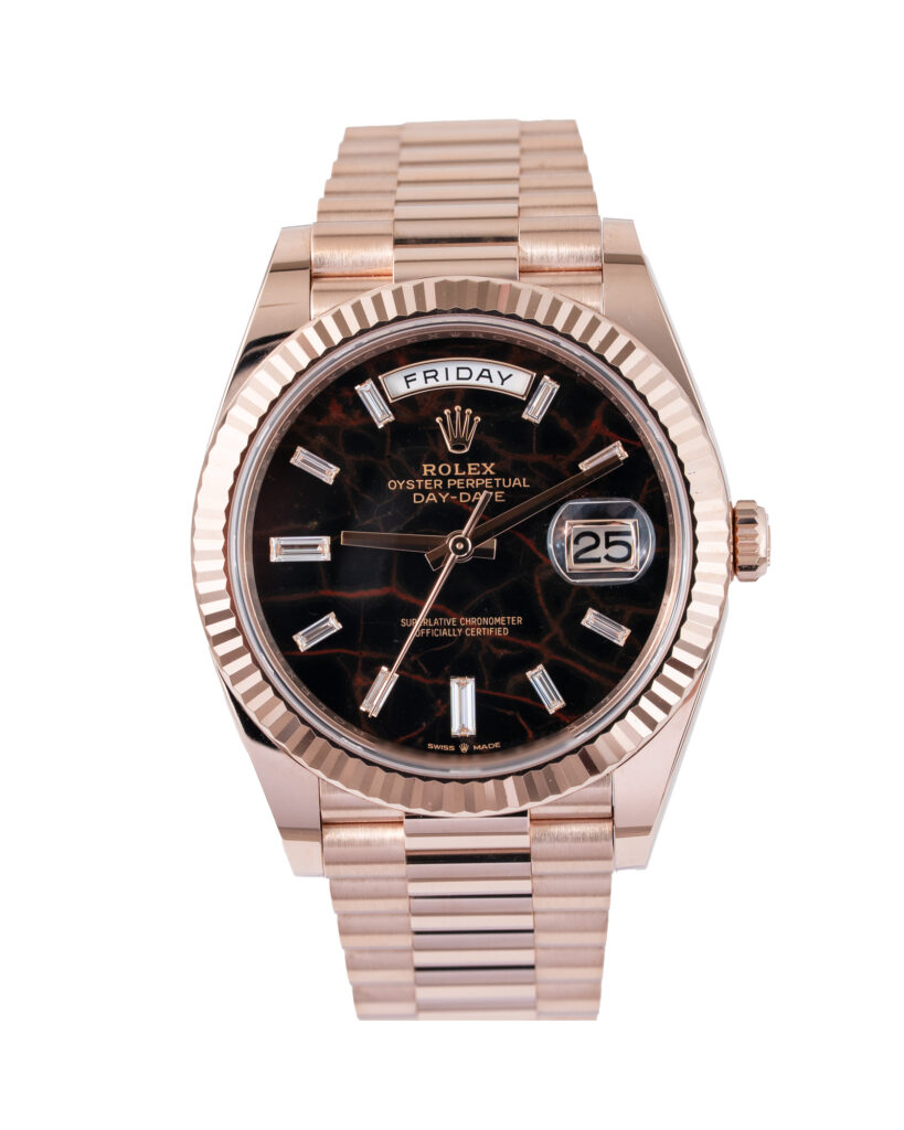 brand: Rolex Reference: 228235 Model: Day-Date case MATERIAL: Rose Gold strap: Bracelet case Size (MM): 40mm Dial colour: Brown Bezel: Rose Gold Year: 06/2024 Condition: Excellent Box papers : Paperwork/box