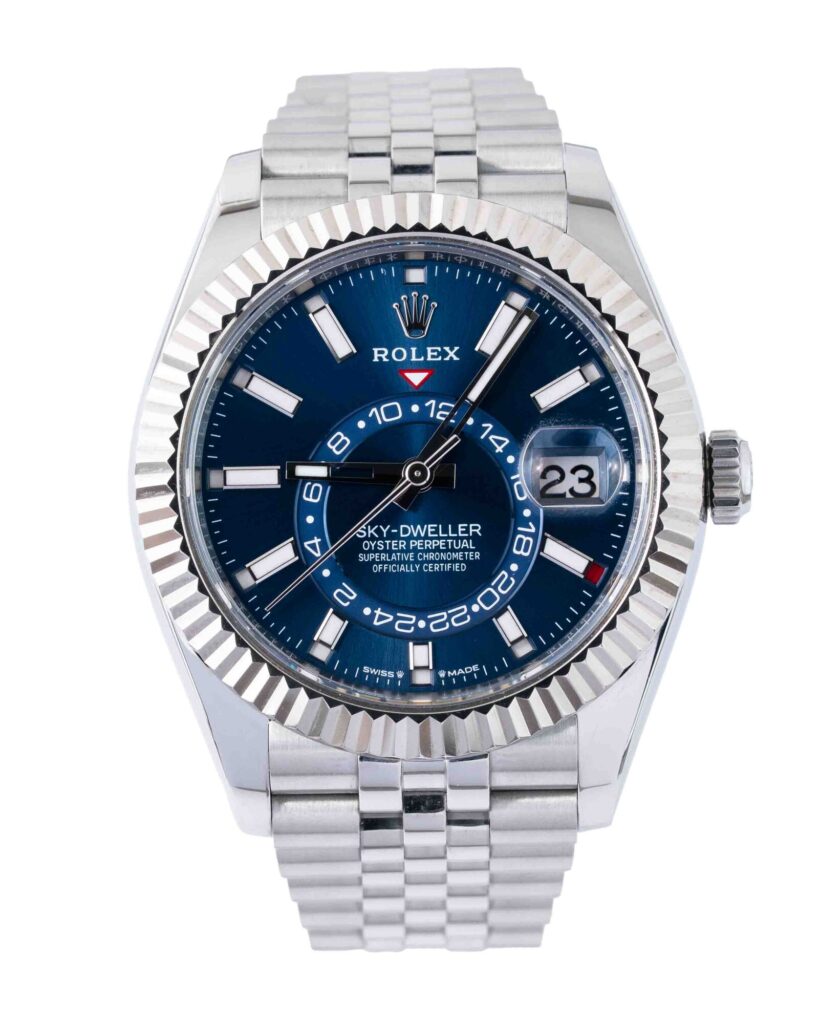 brand: Rolex Reference: 336934 Model: Sky-Dweller case MATERIAL: Steel strap: Bracelet case Size (MM): 42mm Dial colour: Blue Bezel: White Gold Year: 12/2023 Condition: Excellent Box papers : Paperwork/box