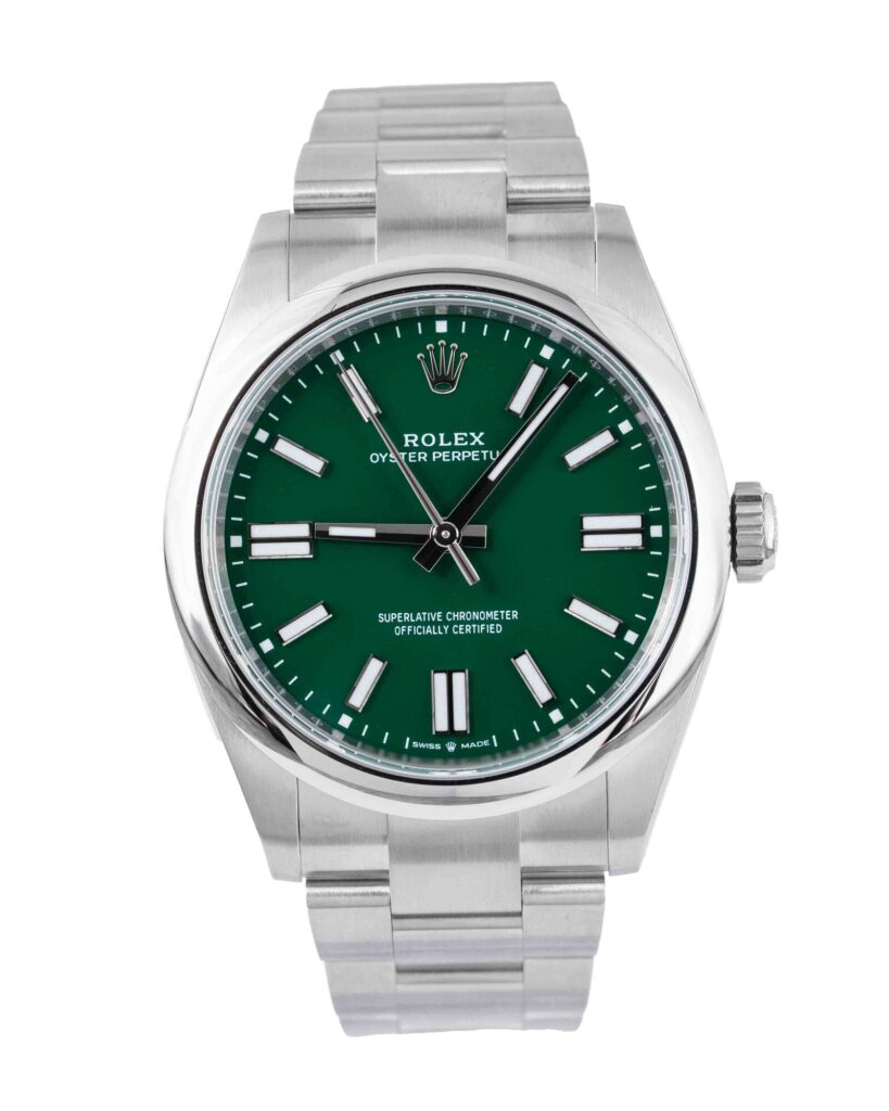 brand: Rolex Reference: 134300 Model: Oyster Perpetual case MATERIAL: Steel strap: Bracelet case Size (MM): 41mm Dial colour: Green Bezel: Steel Year: 06/2025 Condition: Unworn Box papers : Paperwork/box