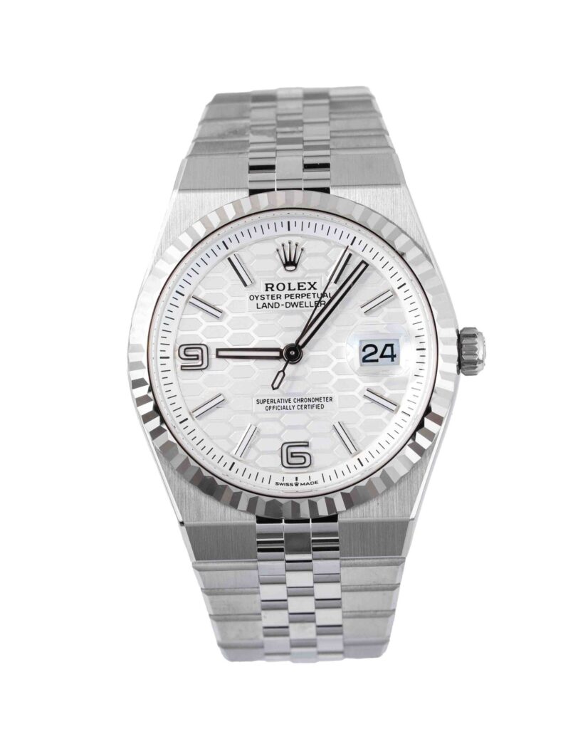 brand: Rolex Reference: 127234 Model: Land-Dweller case MATERIAL: Steel strap: Bracelet Case Size (MM): 36mm Dial colour: White Bezel: White Gold Year: 07/2025 Condition: Unworn Box papers : Paperwork/box