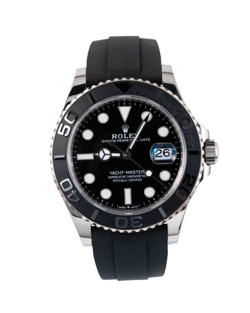 brand: Rolex Reference: 226659 Model: Yacht-Master case MATERIAL: White Gold strap: Rubber case Size (MM): 42mm Dial colour: Black Bezel: White Gold Year: 10/2022 Condition: Excellent Box papers : Paperwork/box