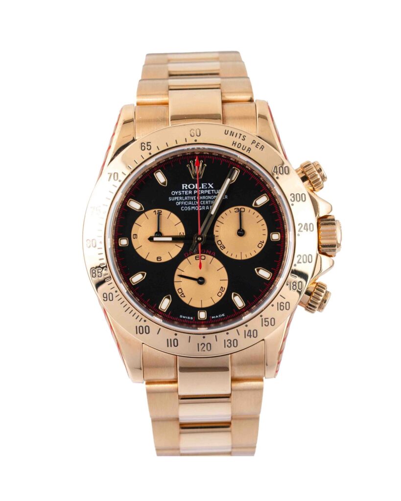 brand: Rolex Reference: 116528 Model: Daytona case MATERIAL: Yellow Gold strap: Bracelet case Size (MM): 40mm Dial colour: Black Bezel: Yellow Gold Year: 09/2008 Condition: Excellent Box papers : Complete