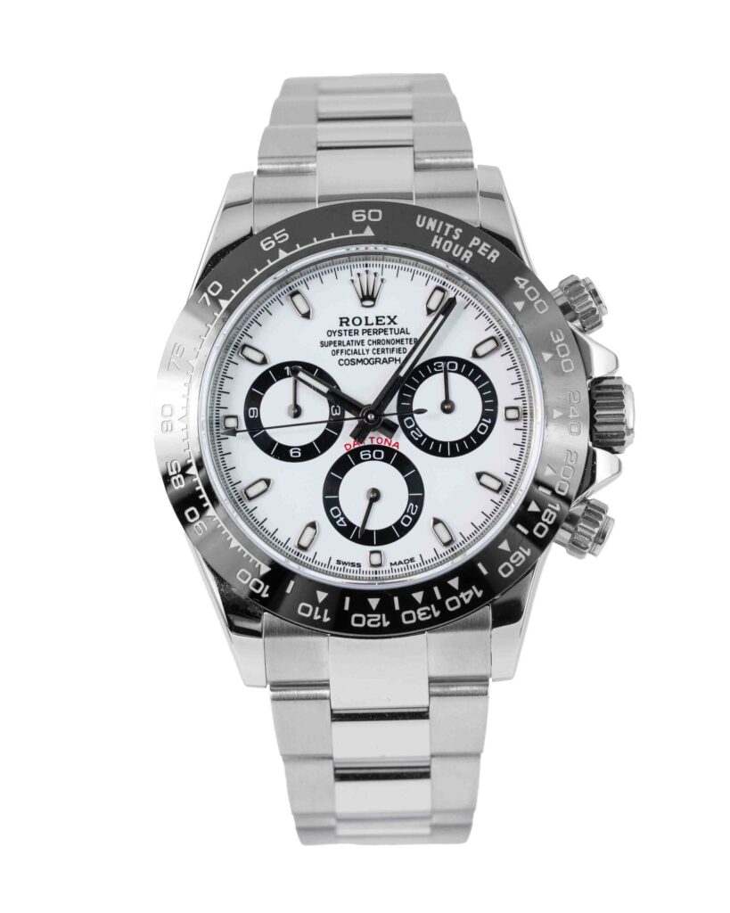 brand: Rolex Reference: 116500LN Model: Daytona case MATERIAL: Steel strap: Bracelet case Size (MM): 40mm Dial colour: White Bezel: Ceramic Year: 06/2017 Condition: Excellent Box papers : Paperwork/box