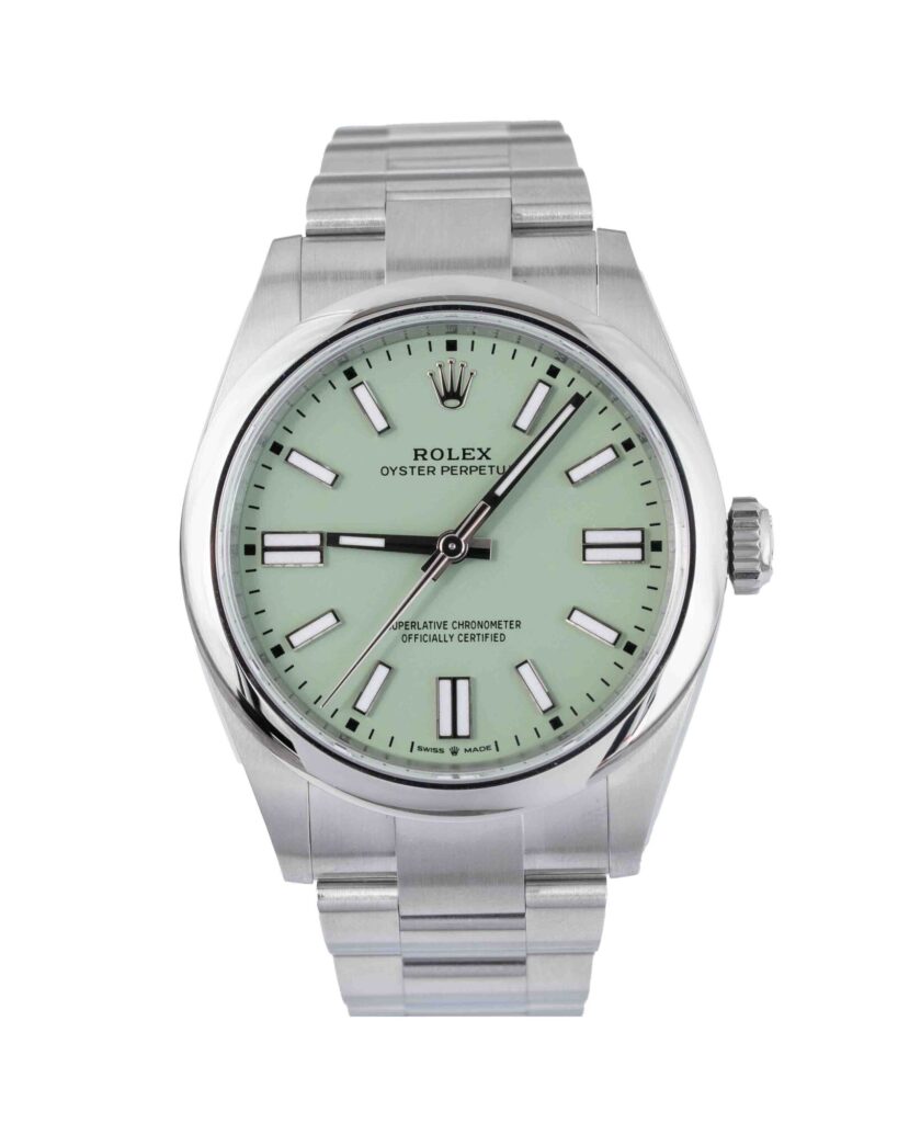 brand: Rolex Reference: 134300 Model: Oyster Perpetual case MATERIAL: Steel strap: Bracelet case Size (MM): 41mm Dial colour: Green Bezel: Steel Year: 07/2025 Condition: Unworn Box papers : Paperwork/box