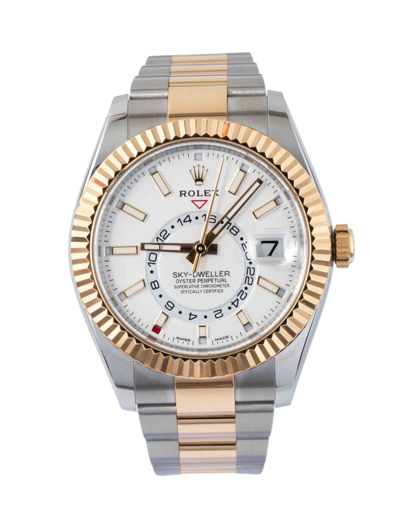 brand: Rolex Reference: 326933 Model: Sky-Dweller case MATERIAL: Steel & Yellow Gold strap: Bracelet case Size (MM): 42mm Dial colour: White Bezel: Yellow Gold Year: 05/2020 Condition: Excellent Box papers : Paperwork/box