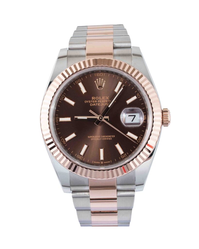 brand: Rolex Reference: 126331 Model: Datejust case MATERIAL: Steel & Rose Gold strap: Bracelet case Size (MM): 41mm Dial colour: Brown Bezel: Rose Gold Condition: Excellent Box papers : Paperwork/box