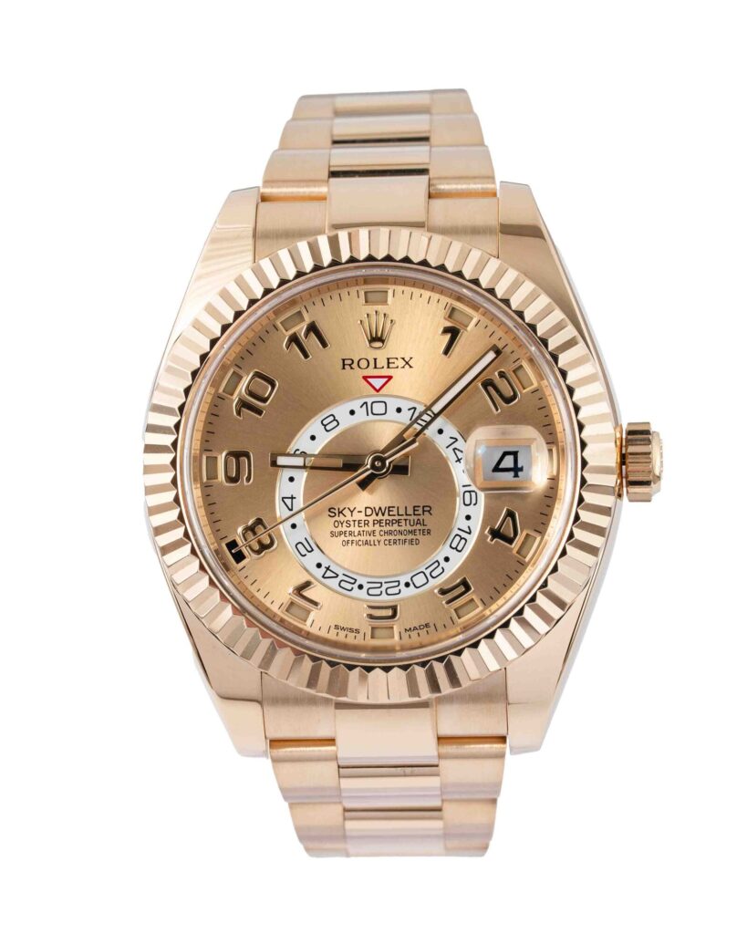 brand: Rolex Reference: 326938 Model: Sky-Dweller case MATERIAL: Yellow Gold strap: Bracelet case Size (MM): 42mm Dial colour: Champagne Bezel: Yellow Gold Year: 11/2017 Condition: Excellent Box papers : Paperwork/box