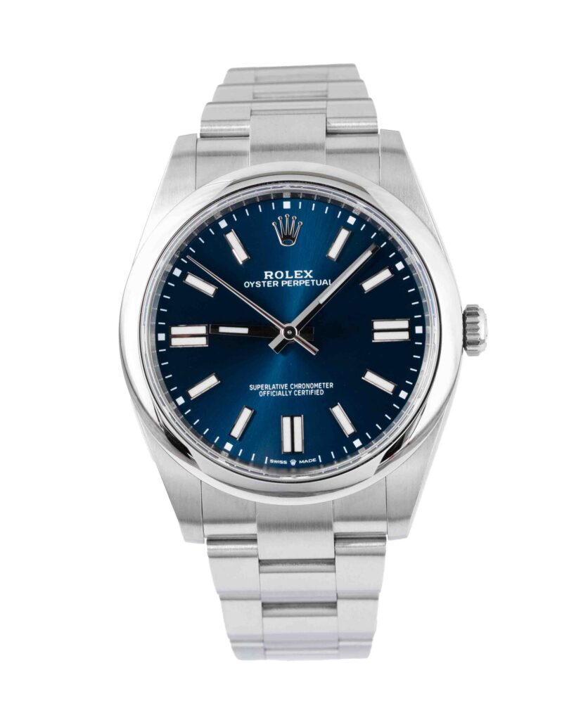 brand: Rolex Reference: 124300 Model: Oyster Perpetual case MATERIAL: Steel strap: Bracelet case Size (MM): 41mm Dial colour: Blue Bezel: Steel Condition: Excellent Box papers : Paperwork/box